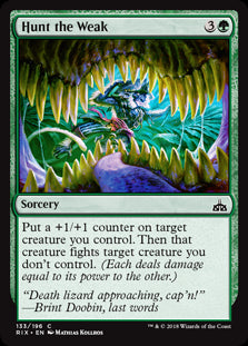 Rivals of IxalanEn stockPut a +1/+1 counter on target creature you control. Then that creature fights target creature you don't control. (Each deals damage equal to its po...