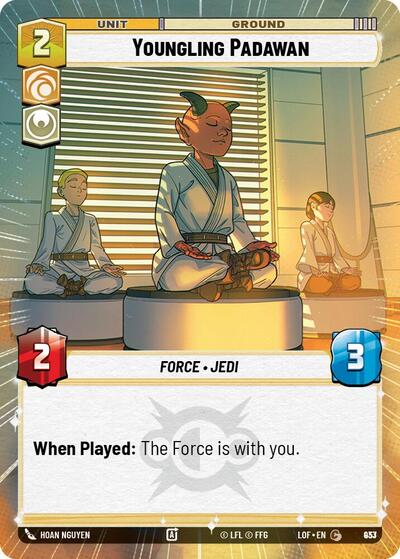 Legends of the ForceStock basThis unit gets +1/+0 if you control another Jedi unit and +1/+0 if you control a Lightsaber upgrade.