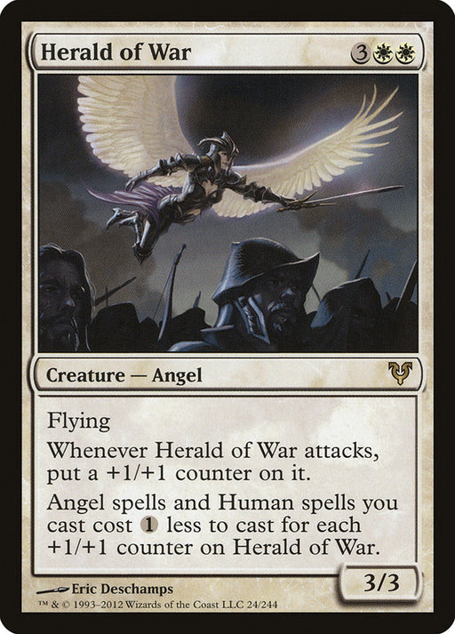 Avacyn RestoredRupture de stockFlying Whenever Herald of War attacks, put a +1/+1 counter on it. Angel spells and Human spells you cast cost {1} less to cast for each +1/+1 count...