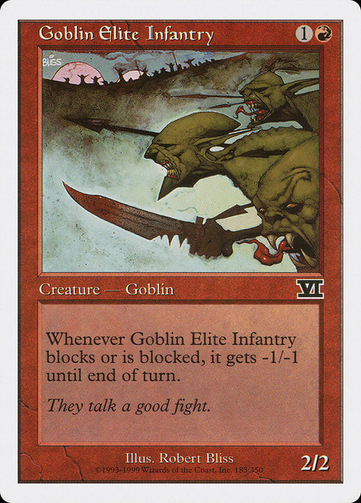 Classic Sixth EditionStock basWhenever Goblin Elite Infantry blocks or becomes blocked, it gets -1/-1 until end of turn.