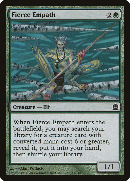 Commander 2011Rupture de stockWhen Fierce Empath enters the battlefield, you may search your library for a creature card with converted mana cost 6 or greater, reveal it, put it...