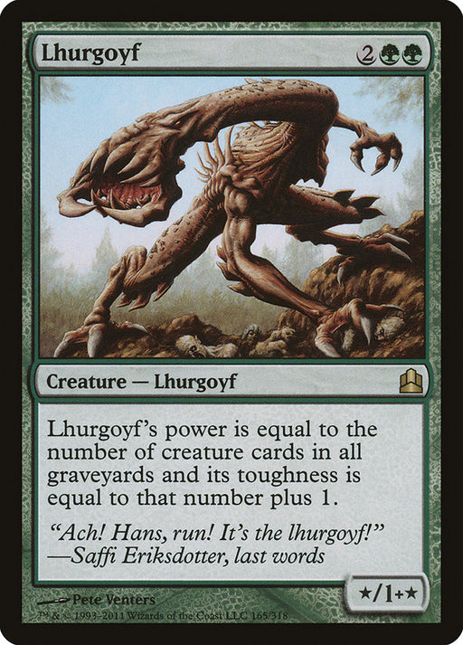 Commander 2011Rupture de stockLhurgoyf's power is equal to the number of creature cards in all graveyards and its toughness is equal to that number plus 1.