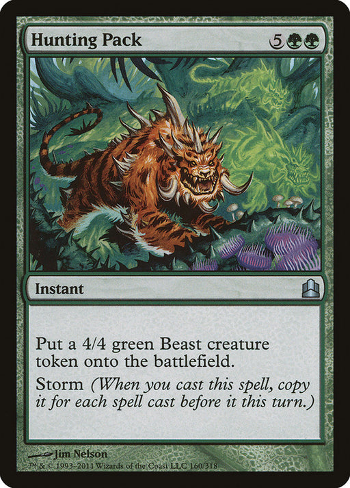 Commander 2011Rupture de stockCreate a 4/4 green Beast creature token. Storm (When you cast this spell, copy it for each spell cast before it this turn.)