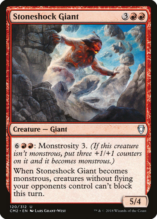 Commander Anthology Volume IIStock bas{6}{R}{R}: Monstrosity 3. (If this creature isn't monstrous, put three +1/+1 counters on it and it becomes monstrous.) When Stoneshock Giant become...