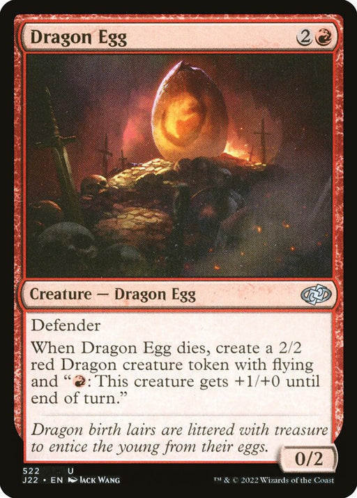Jumpstart 2022Rupture de stockDefender When Dragon Egg dies, create a 2/2 red Dragon creature token with flying and "{R}: This creature gets +1/+0 until end of turn."