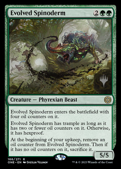 Phyrexia: All Will Be One PromosStock basEvolved Spinoderm enters the battlefield with four oil counters on it. Evolved Spinoderm has trample as long as it has two or fewer oil counters on...