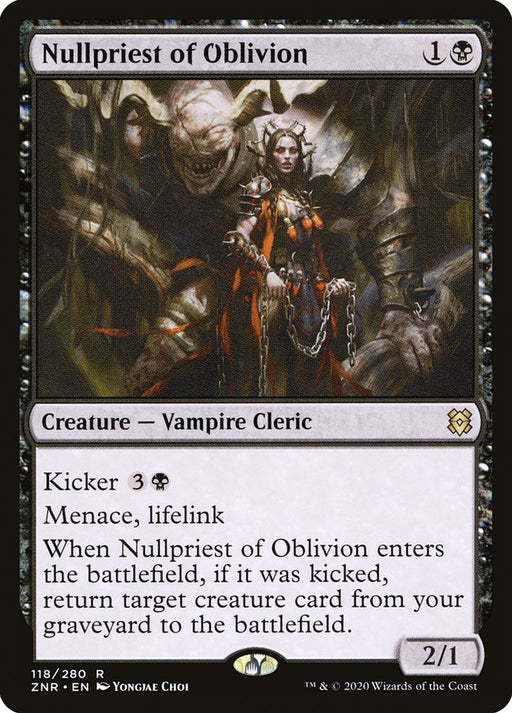 Zendikar RisingRupture de stockKicker {3}{B} Menace, lifelink When Nullpriest of Oblivion enters the battlefield, if it was kicked, return target creature card from your graveyar...