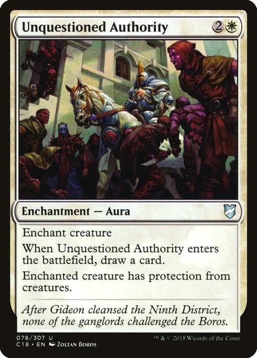 Commander 2018Rupture de stockEnchant creature When Unquestioned Authority enters the battlefield, draw a card. Enchanted creature has protection from creatures.