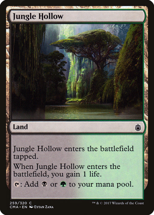 Commander AnthologyRupture de stockJungle Hollow enters the battlefield tapped. When Jungle Hollow enters the battlefield, you gain 1 life. {T}: Add {B} or {G}.