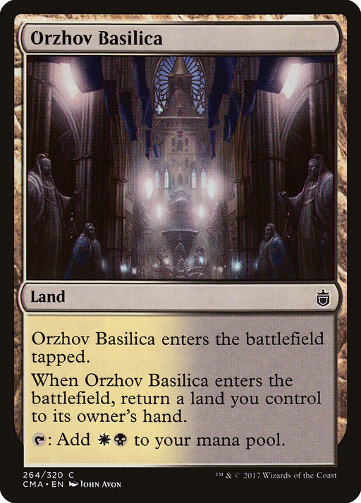 Commander AnthologyRupture de stockOrzhov Basilica enters the battlefield tapped. When Orzhov Basilica enters the battlefield, return a land you control to its owner's hand. {T}: Add...