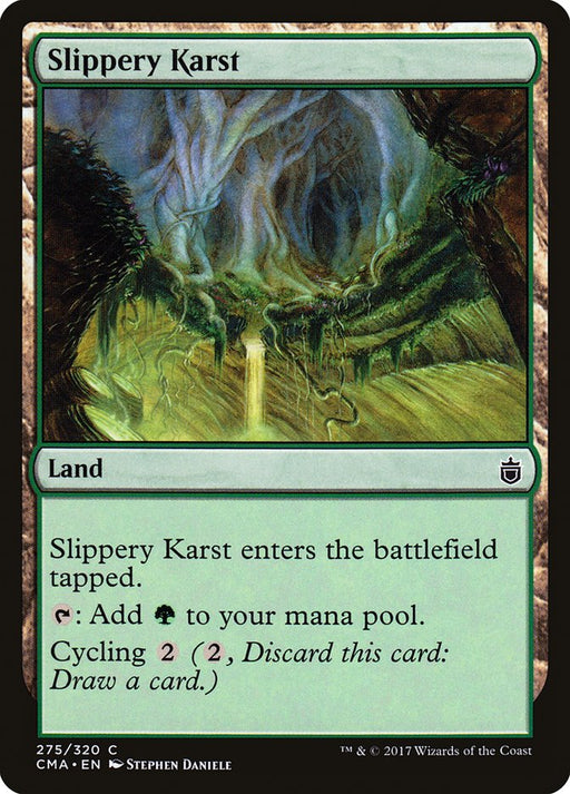 Commander AnthologyRupture de stockSlippery Karst enters the battlefield tapped. {T}: Add {G}. Cycling {2} ({2}, Discard this card: Draw a card.)
