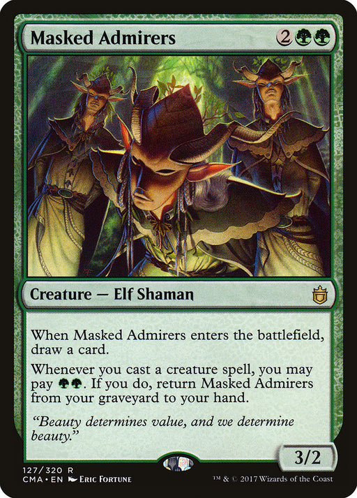 Commander AnthologyStock basWhen Masked Admirers enters the battlefield, draw a card. Whenever you cast a creature spell, you may pay {G}{G}. If you do, return Masked Admirers...