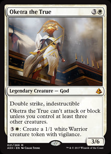 AmonkhetStock basDouble strike, indestructible Oketra the True can't attack or block unless you control at least three other creatures. {3}{W}: Create a 1/1 white W...
