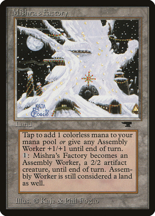 AntiquitiesRupture de stock{T}: Add {C}. {1}: Mishra's Factory becomes a 2/2 Assembly-Worker artifact creature until end of turn. It's still a land. {T}: Target Assembly-Work...