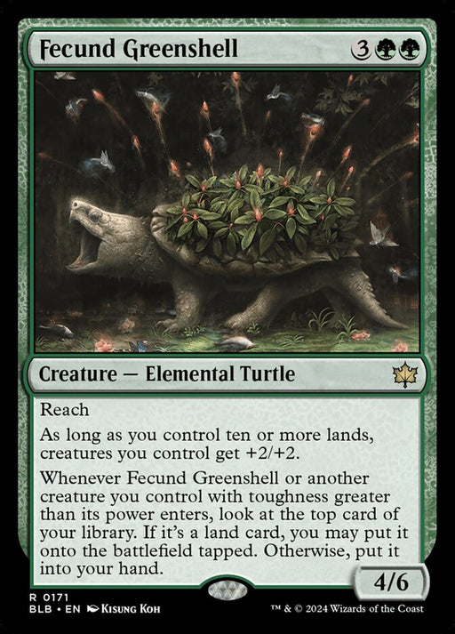 BloomburrowRupture de stockReach As long as you control ten or more lands, creatures you control get +2/+2. Whenever Fecund Greenshell or another creature you control with to...