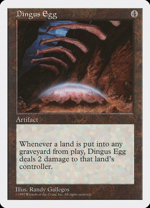 Fifth EditionStock basWhenever a land is put into a graveyard from the battlefield, Dingus Egg deals 2 damage to that land's controller.