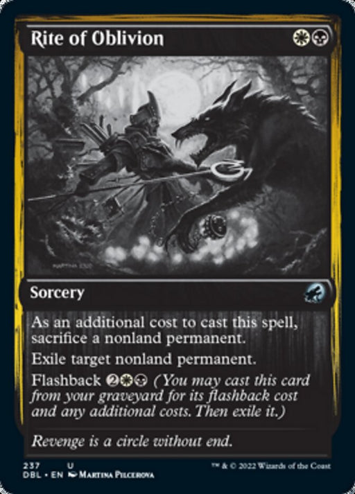 Innistrad: Double FeatureRupture de stockAs an additional cost to cast this spell, sacrifice a nonland permanent. Exile target nonland permanent. Flashback {2}{W}{B} (You may cast this car...