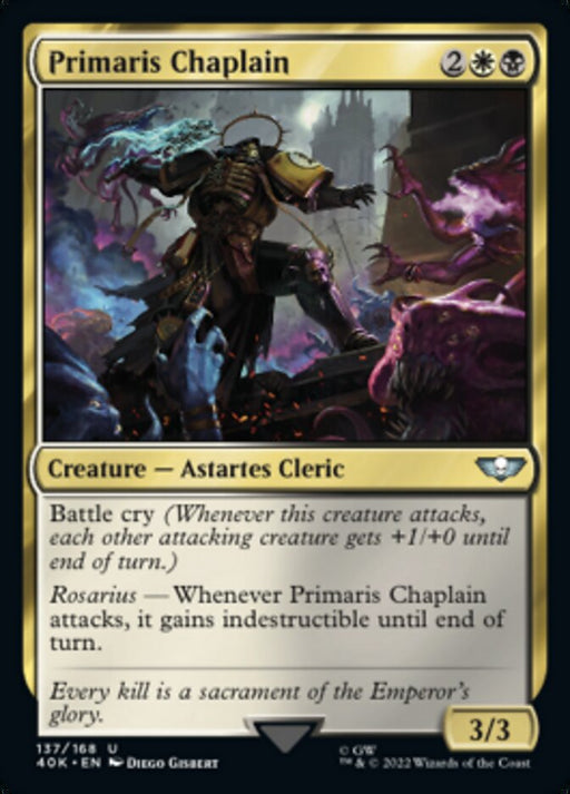 Warhammer 40000 CommanderRupture de stockBattle cry (Whenever this creature attacks, each other attacking creature gets +1/+0 until end of turn.) Rosarius — Whenever Primaris Chaplain atta...