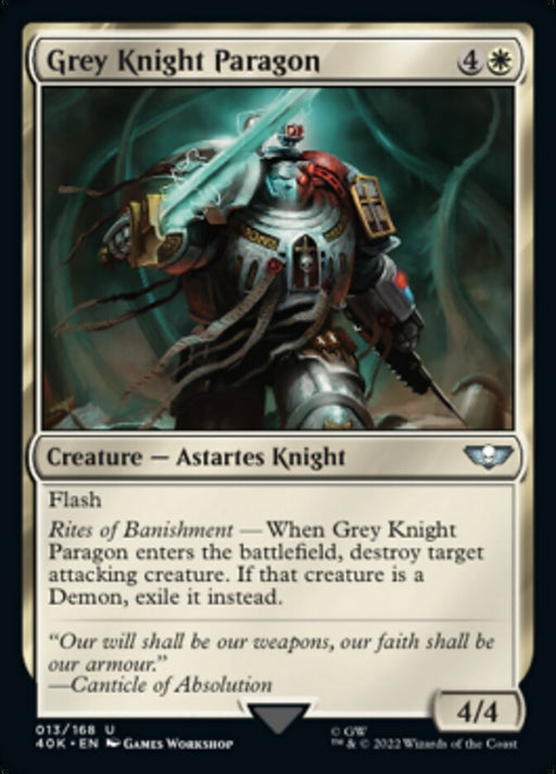 Warhammer 40000 CommanderRupture de stockFlash Rites of Banishment — When Grey Knight Paragon enters the battlefield, destroy target attacking creature. If that creature is a Demon, exile ...