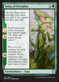 DominariaEn stock(As this Saga enters and after your draw step, add a lore counter. Sacrifice after III.) I, II — Until your next turn, creatures you control gain "...