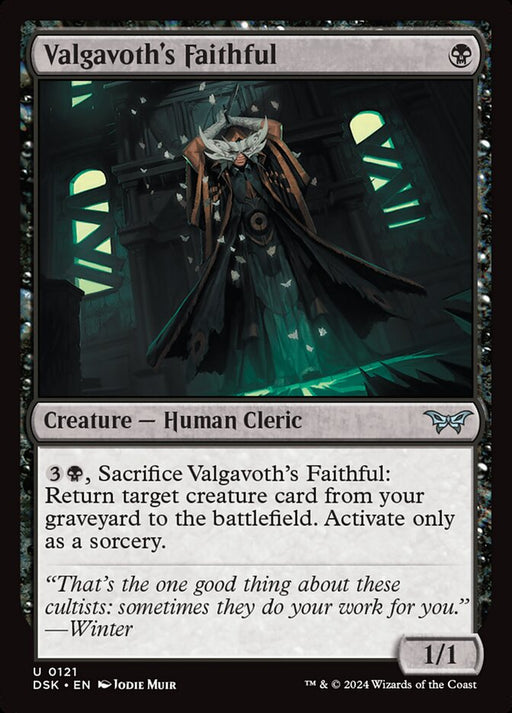 Duskmourn: House of HorrorStock bas{3}{B}, Sacrifice Valgavoth's Faithful: Return target creature card from your graveyard to the battlefield. Activate only as a sorcery.