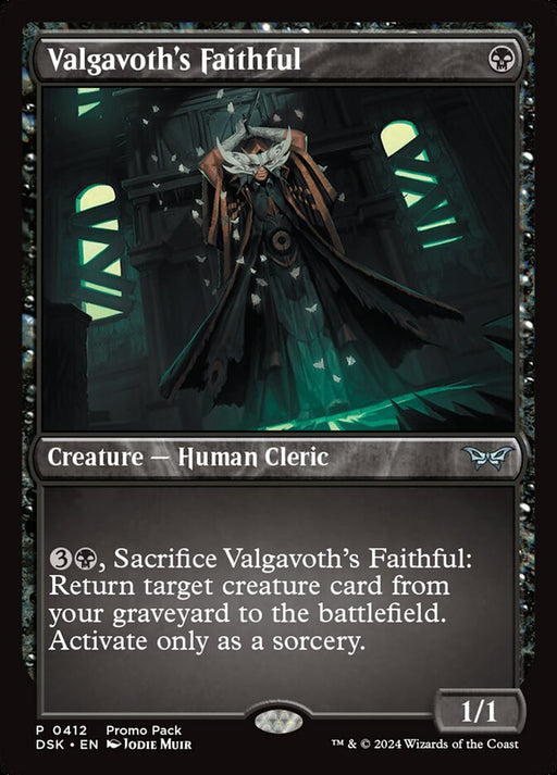 Duskmourn: House of HorrorRupture de stock{3}{B}, Sacrifice Valgavoth's Faithful: Return target creature card from your graveyard to the battlefield. Activate only as a sorcery.