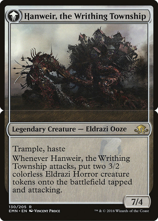Eldritch MoonRupture de stockTrample, haste Whenever Hanweir, the Writhing Township attacks, create two 3/2 colorless Eldrazi Horror creature tokens that are tapped and attacking.