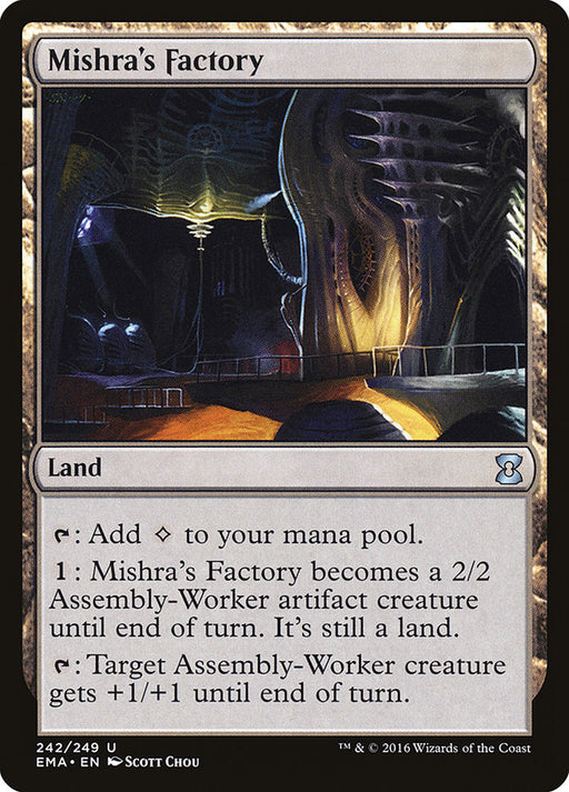 Eternal MastersEn stock{T}: Add {C}. {1}: Mishra's Factory becomes a 2/2 Assembly-Worker artifact creature until end of turn. It's still a land. {T}: Target Assembly-Work...
