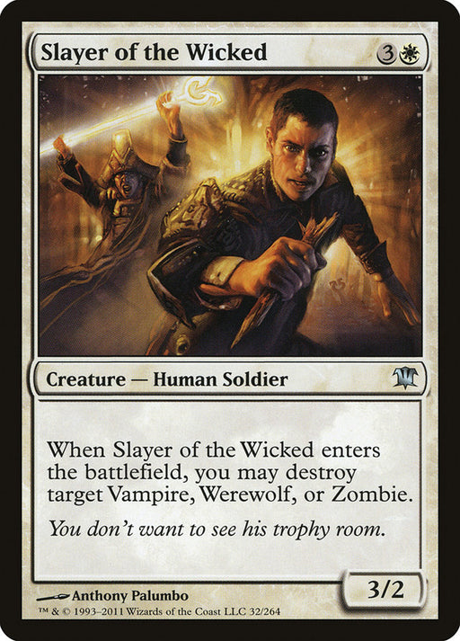 InnistradEn stockWhen Slayer of the Wicked enters the battlefield, you may destroy target Vampire, Werewolf, or Zombie.