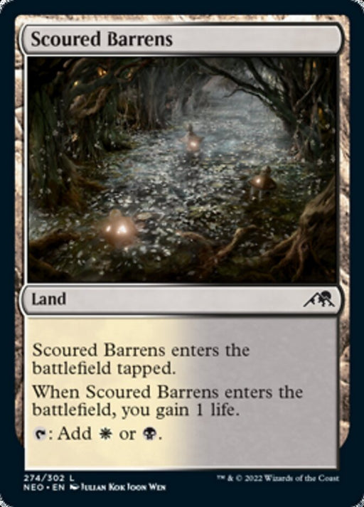 Kamigawa: Neon DynastyEn stockScoured Barrens enters the battlefield tapped. When Scoured Barrens enters the battlefield, you gain 1 life. {T}: Add {W} or {B}.