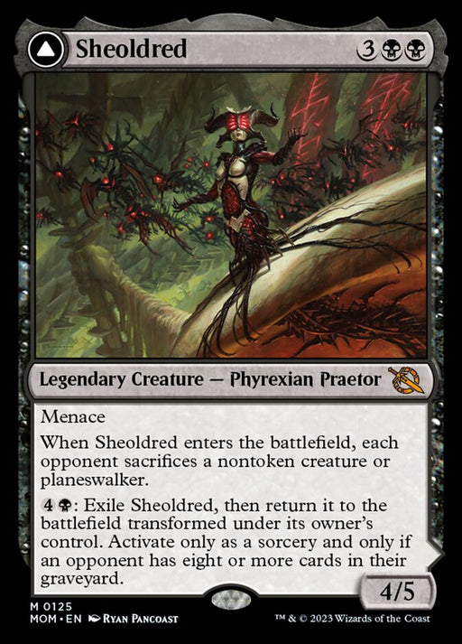 March of the MachineRupture de stockMenace When Sheoldred enters the battlefield, each opponent sacrifices a nontoken creature or planeswalker. {4}{B}: Exile Sheoldred, then return it...