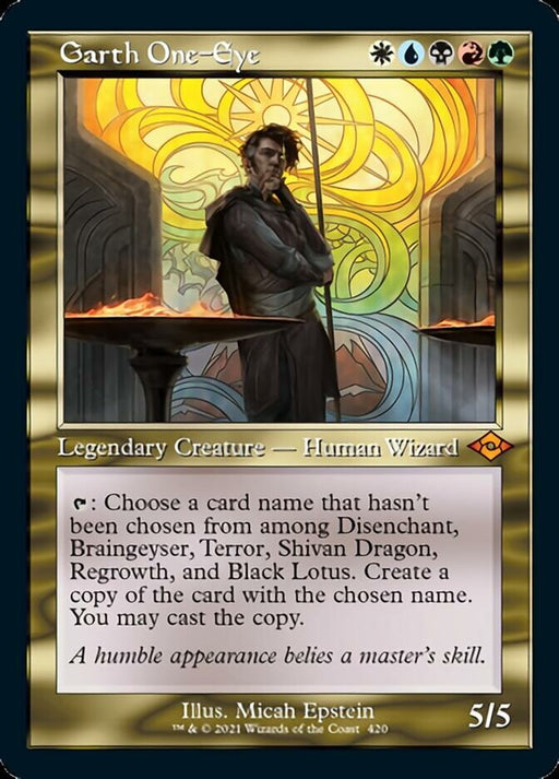 Modern Horizons 2Rupture de stock{T}: Choose a card name that hasn't been chosen from among Disenchant, Braingeyser, Terror, Shivan Dragon, Regrowth, and Black Lotus. Create a copy...