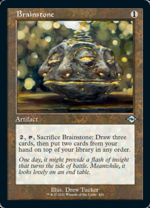 Modern Horizons 2Stock bas{2}, {T}, Sacrifice Brainstone: Draw three cards, then put two cards from your hand on top of your library in any order.
