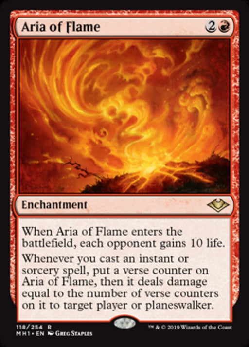 Modern HorizonsRupture de stockWhen Aria of Flame enters the battlefield, each opponent gains 10 life. Whenever you cast an instant or sorcery spell, put a verse counter on Aria ...