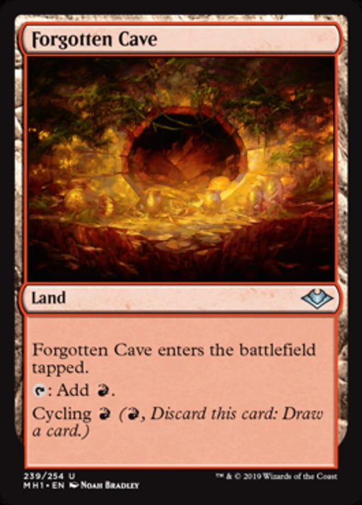Modern HorizonsEn stockForgotten Cave enters the battlefield tapped. {T}: Add {R}. Cycling {R} ({R}, Discard this card: Draw a card.)