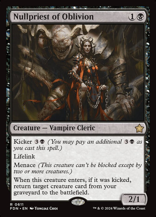 FoundationsRupture de stockKicker {3}{B} Menace, lifelink When Nullpriest of Oblivion enters, if it was kicked, return target creature card from your graveyard to the battlef...