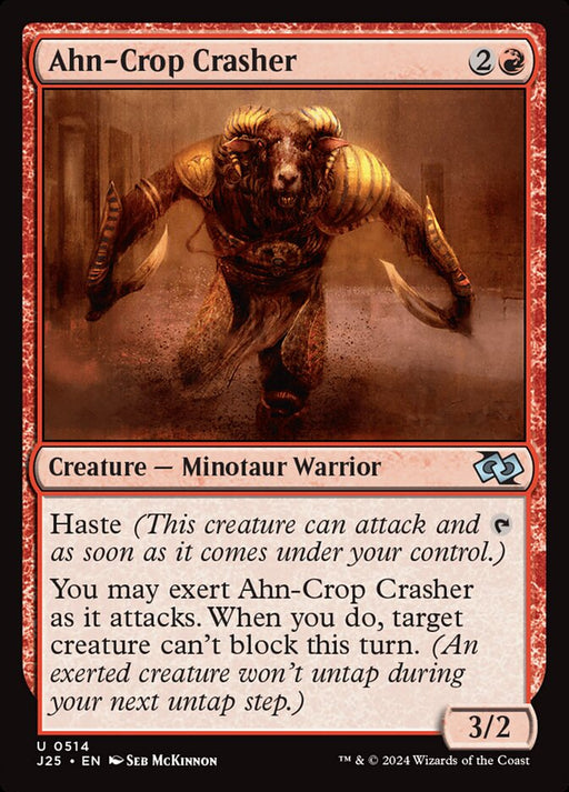 Foundations JumpstartRupture de stockHaste You may exert Ahn-Crop Crasher as it attacks. When you do, target creature can't block this turn. (An exerted creature won't untap during you...