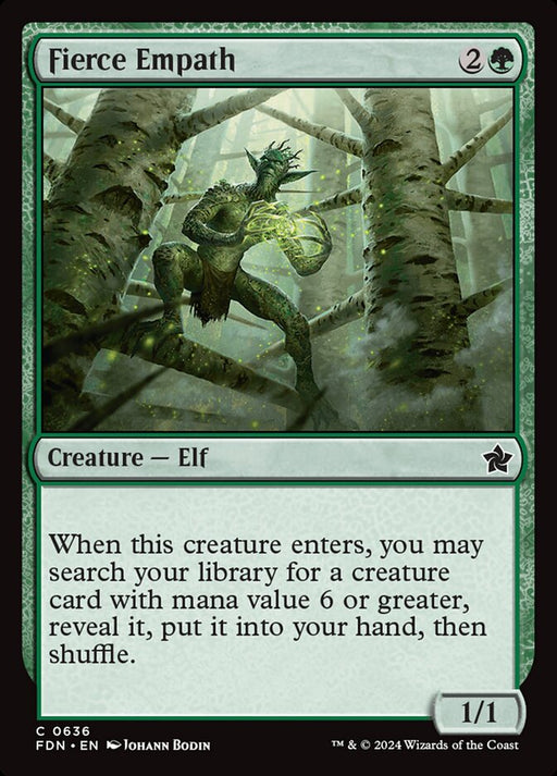 FoundationsRupture de stockWhen Fierce Empath enters, you may search your library for a creature card with mana value 6 or greater, reveal it, put it into your hand, then shu...
