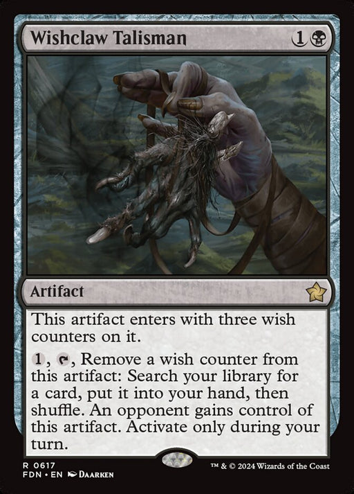 FoundationsRupture de stockWishclaw Talisman enters with three wish counters on it. {1}, {T}, Remove a wish counter from Wishclaw Talisman: Search your library for a card, pu...