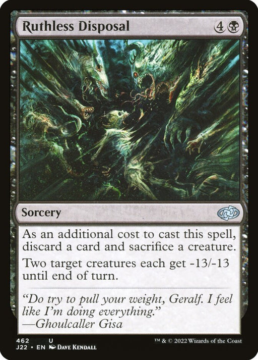 Jumpstart 2022Stock basAs an additional cost to cast this spell, discard a card and sacrifice a creature. Two target creatures each get -13/-13 until end of turn.