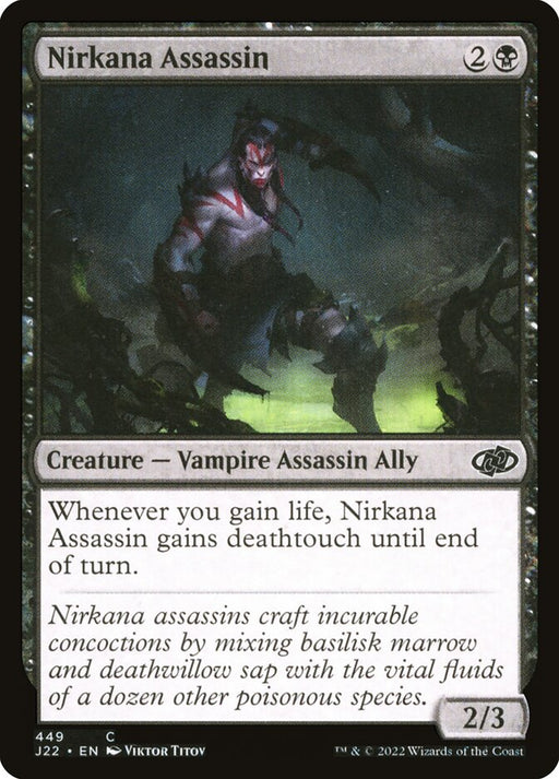 Jumpstart 2022Stock basWhenever you gain life, Nirkana Assassin gains deathtouch until end of turn. (Any amount of damage it deals to a creature is enough to destroy it.)