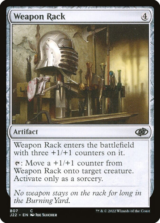 Jumpstart 2022Stock basWeapon Rack enters the battlefield with three +1/+1 counters on it. {T}: Move a +1/+1 counter from Weapon Rack onto target creature. Activate only ...