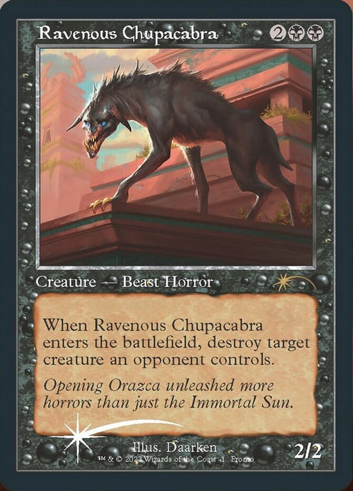Wizards Play Network 2023Stock basWhen Ravenous Chupacabra enters the battlefield, destroy target creature an opponent controls.