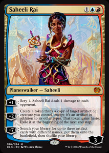KaladeshRupture de stock[+1]: Scry 1. Saheeli Rai deals 1 damage to each opponent. [−2]: Create a token that's a copy of target artifact or creature you control, except it...