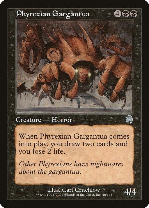 ApocalypseRupture de stockWhen Phyrexian Gargantua enters the battlefield, you draw two cards and you lose 2 life.