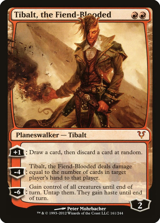 Avacyn RestoredRupture de stock[+1]: Draw a card, then discard a card at random. [-4]: Tibalt, the Fiend-Blooded deals damage equal to the number of cards in target player's han...