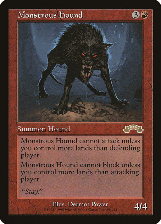 ExodusRupture de stockMonstrous Hound can't attack unless you control more lands than defending player. Monstrous Hound can't block unless you control more lands than at...