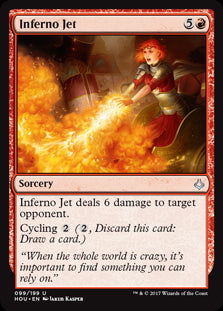 Hour of DevastationEn stockInferno Jet deals 6 damage to target opponent or planeswalker. Cycling {2} ({2}, Discard this card: Draw a card.)