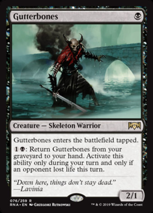 Ravnica AllegianceStock basGutterbones enters the battlefield tapped. {1}{B}: Return Gutterbones from your graveyard to your hand. Activate this ability only during your turn...