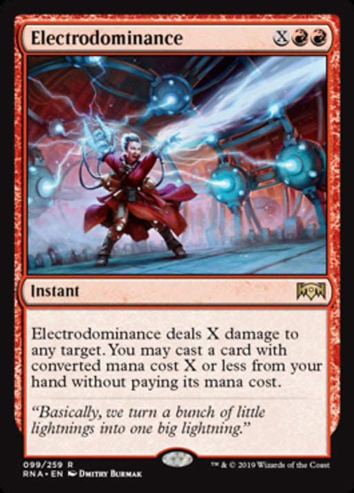 Ravnica AllegianceStock basElectrodominance deals X damage to any target. You may cast a card with converted mana cost X or less from your hand without paying its mana cost.